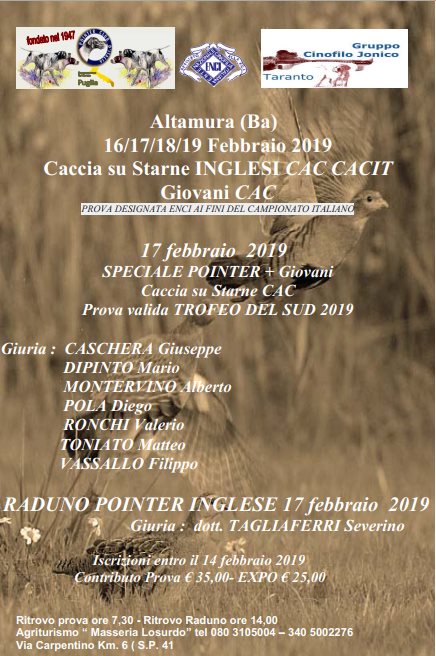 Domenica 17 febbraio sotto la guida di Mimmo Piupillo si è tenuta ad altamura la prima prova valida per il Trofeo del Sud, splendidi i terreni pluri collaudati in attesa di ricevere il Derby del 22/23/24 Febbraio.