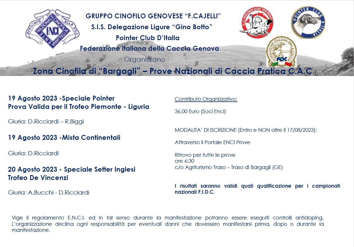 ricordiamo l'appuntamento della prova che si disputerà a Bargagli (Ge) Sabato 19 Agosto, facente parte del Trofeo Piemonte - Liguria.