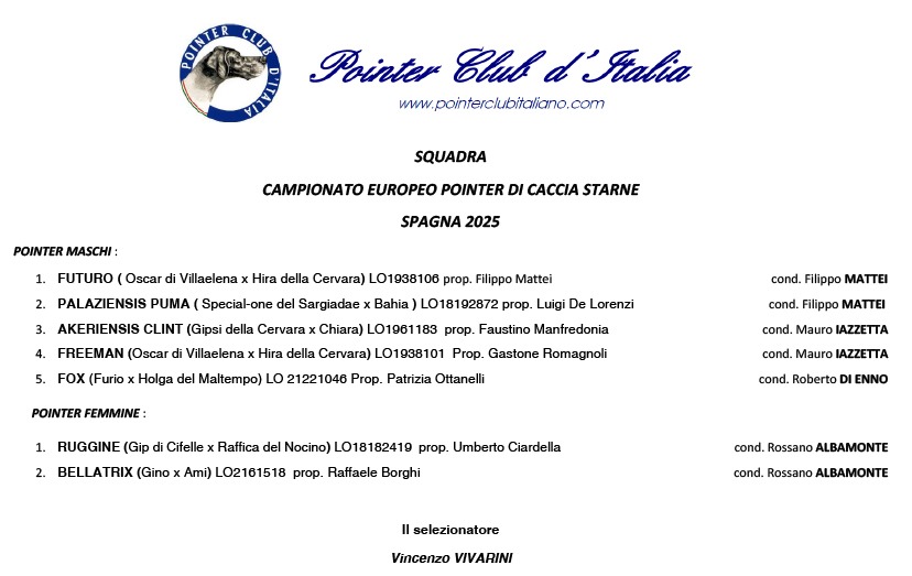 Il Consiglio del Pointer Club d'Italia, con l'ultima delibera del 29 Luglio, ha nominato i selezionatori per i prossimi Campionati Europei Pointer primaverili che si svolgeranno in Spagna a metà Febbraio 2025: